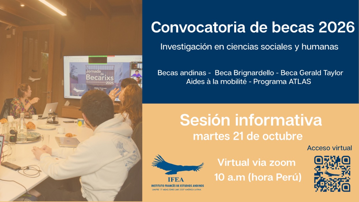 El Instituto Francés de Estudios Andinos abre su convocatoria de becas de investigación para el año 2026. Estas becas están destinadas a apoyar proyectos de campo y de investigación en Ciencias Humanas y Sociales (arqueología, antropología, historia, lingüística, geografía, etc.) en los países andinos (Bolivia, Colombia, Ecuador y Perú).